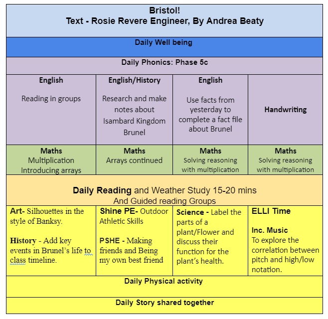 - You will find below a grid showing the sessions to be taught each week. They do not exactly follow days as each class has different sessions due to support and PE times being different but it allows you to see the week as a snapshot of sessions.