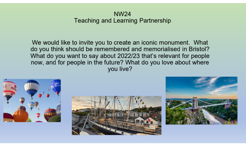 Miss Quinn would love it if as many of you as possible could take part in the NW24 Bristol Monument Competition! Artwork can be a painting, a drawing, a sculpture or a collage.