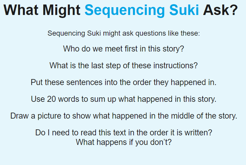 If you would like to support your child at home with their learning you can practise some ‘Sequencing Suki’ skills with them by asking them these questions when doing their daily reading with them.