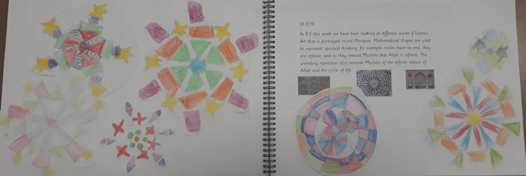 The children enjoyed making some very special art work in RE this week. We learnt about the art used to decorate mosques and how the circular patterns encourage spiritual thinking. The children made their own templates of different shapes and used tessellation to create beautiful patterns.